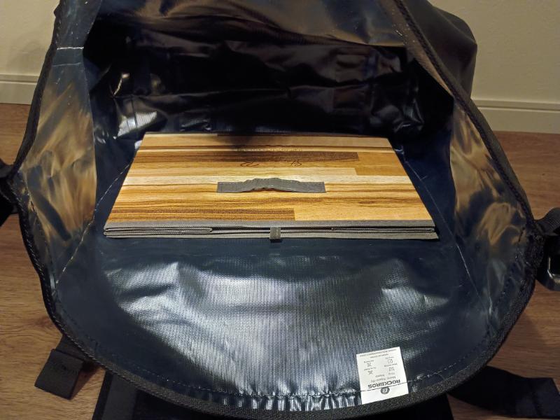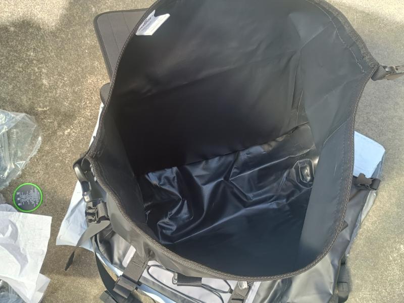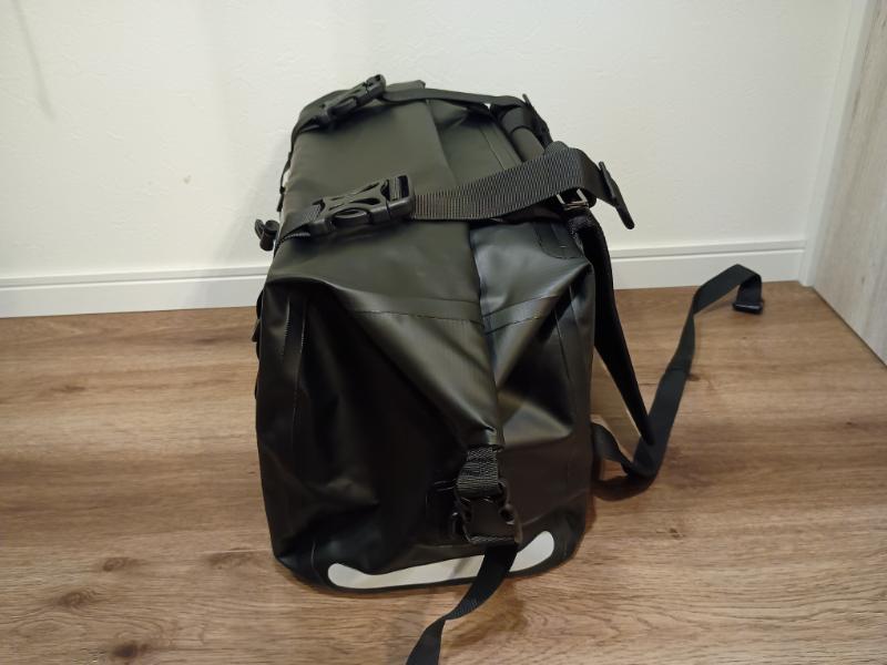 バッグの上部を締めてみました。防水サイドバッグは上部を何回か折り返して巻く必要があるので、結構ギリギリでした。これで2回折りこんでいます。高さは25cm以上あったら上部が閉まらず、防水機能が発揮されないかもしれません。