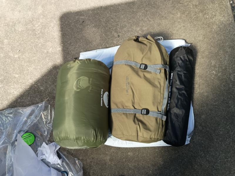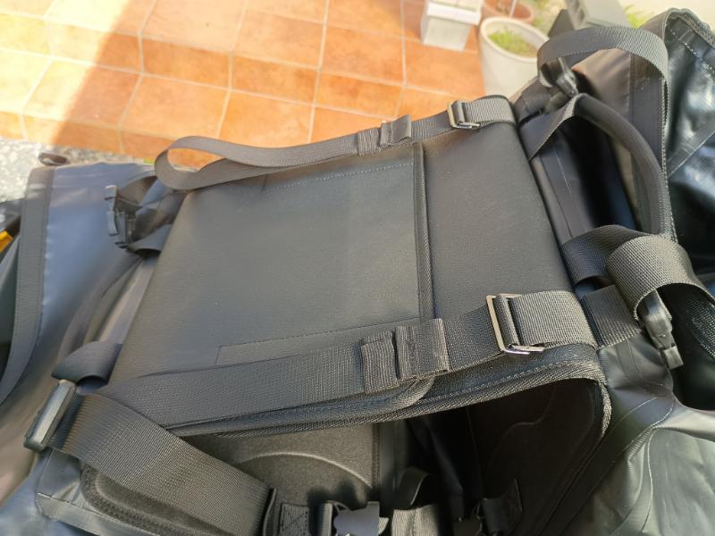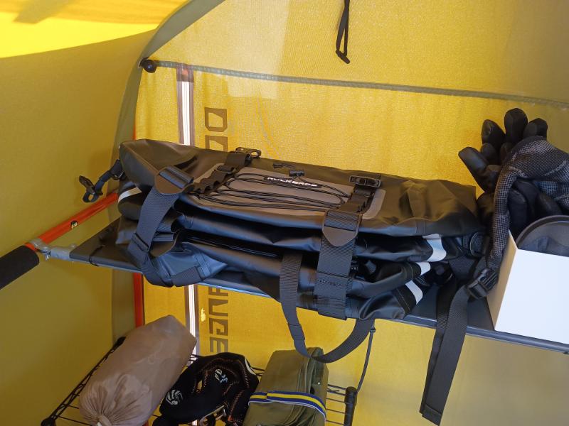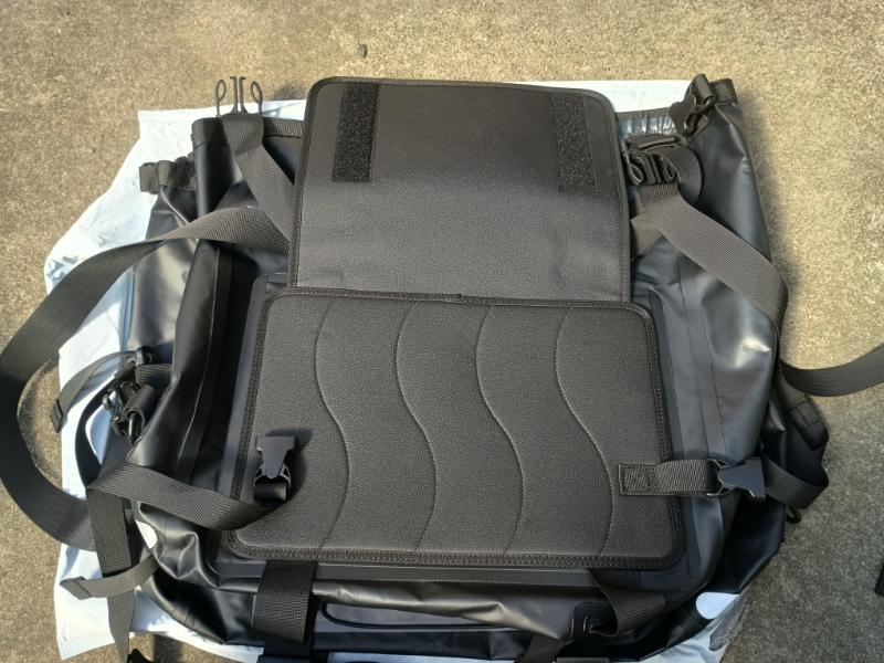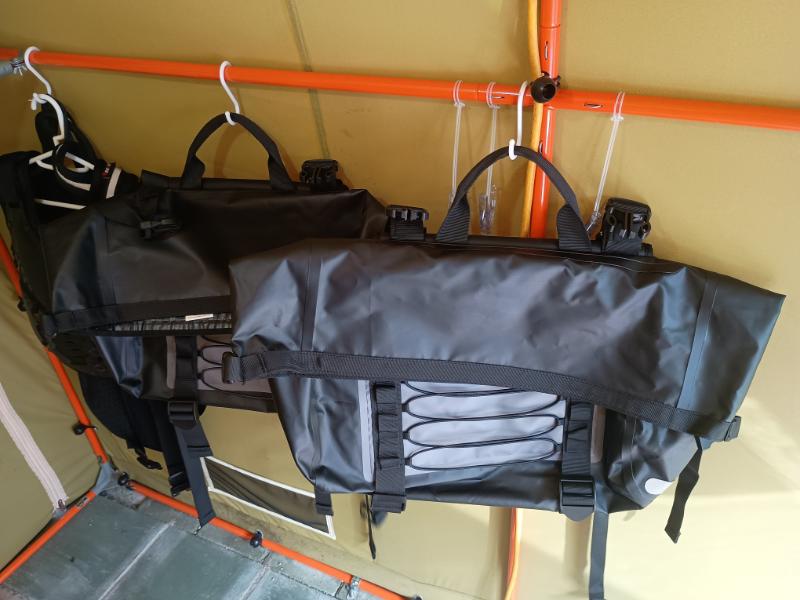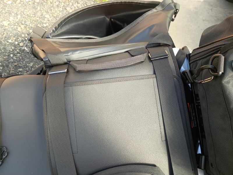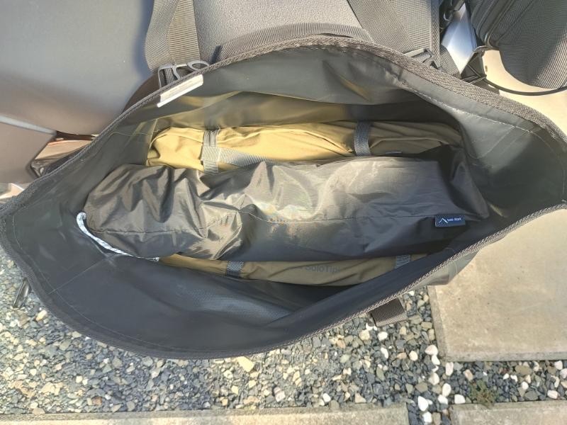 左側には、ソロティピー1TCとモノポールインナーテントをいれました。モノポールインナーテントは長さが54cmぐらいありますが、バッグが柔らかく変形するため入りました。パニアケースにはできない芸当です。