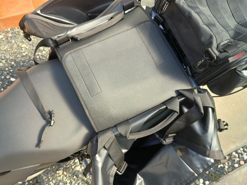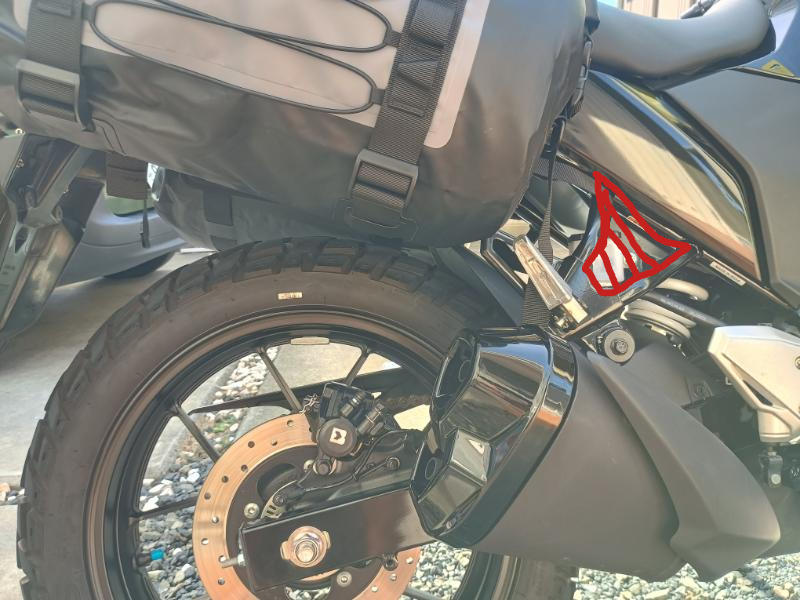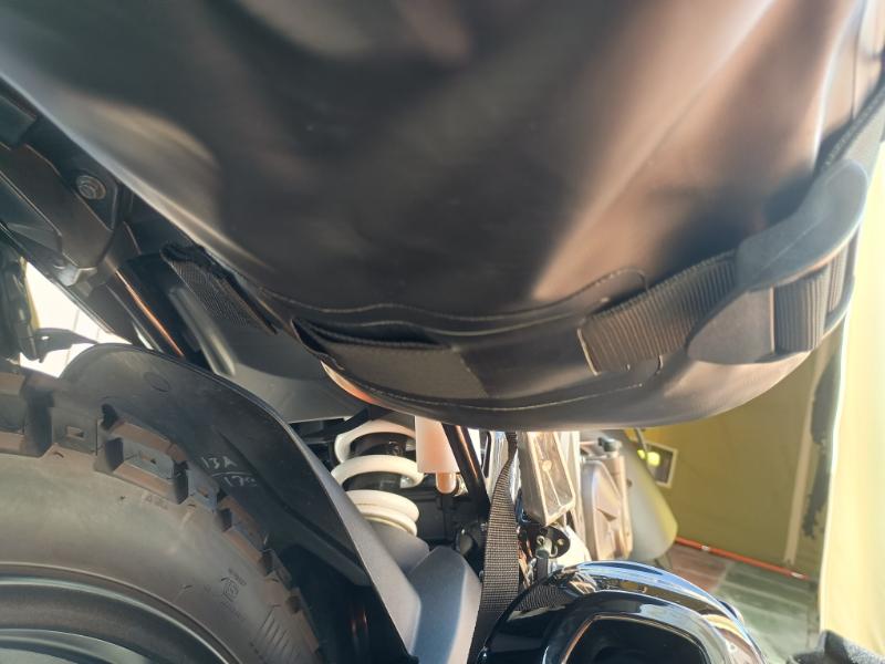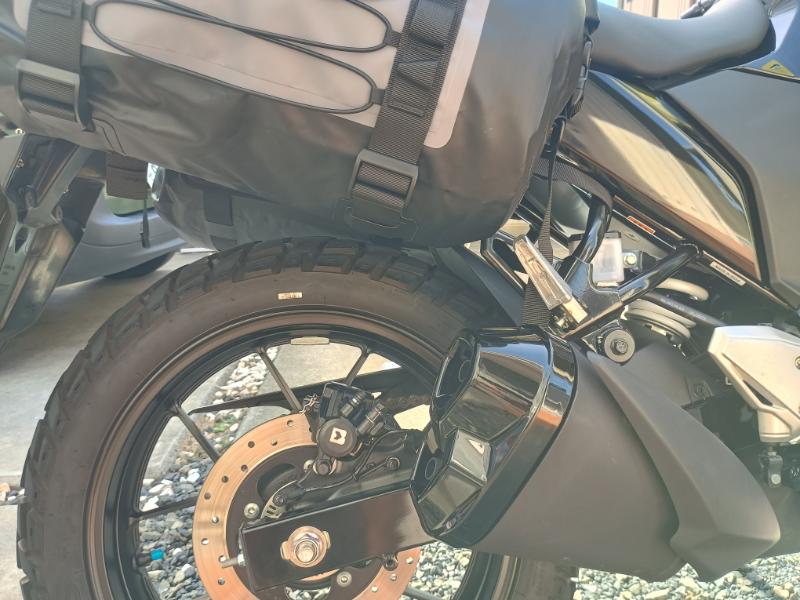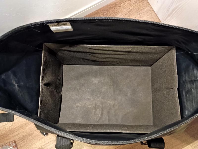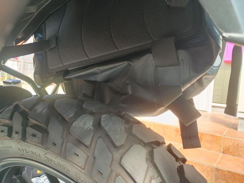 何も入れていない状態ではカバンが垂れ下がり、タイヤやマフラーに当たりそうです。中に形を保持できる枠などを入れたほうが良いかもしれません。