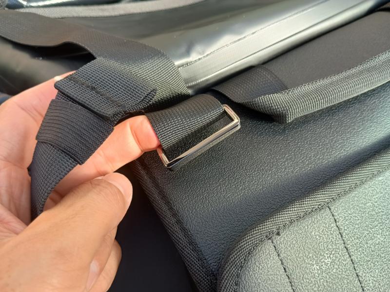 この2本のベルトでバッグの重さを支える仕組みなので、ベルクロ同士の接着面積が少なくても問題ないと思います。