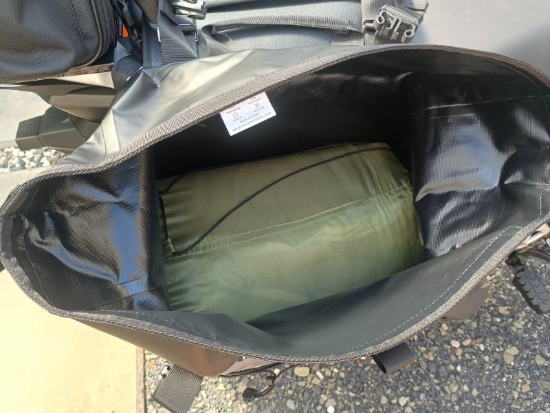 右側には、シュラフ。まだまだ余裕があります。入れるものによって柔軟に形が変わるため、ハードケースの30㍑よりも多く入る気がします。