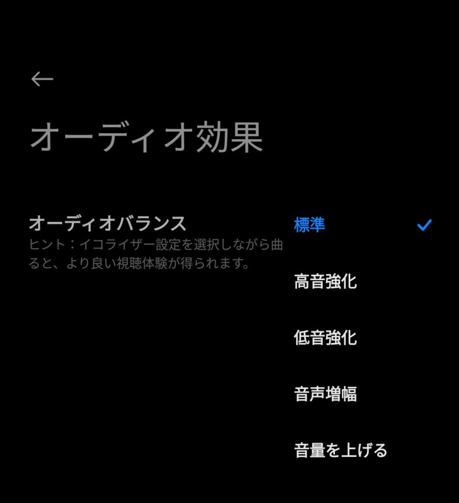 詳細なイコライザーの調整はできませんが、以下の5つプリセットから好みに合わせて選ぶことができます。